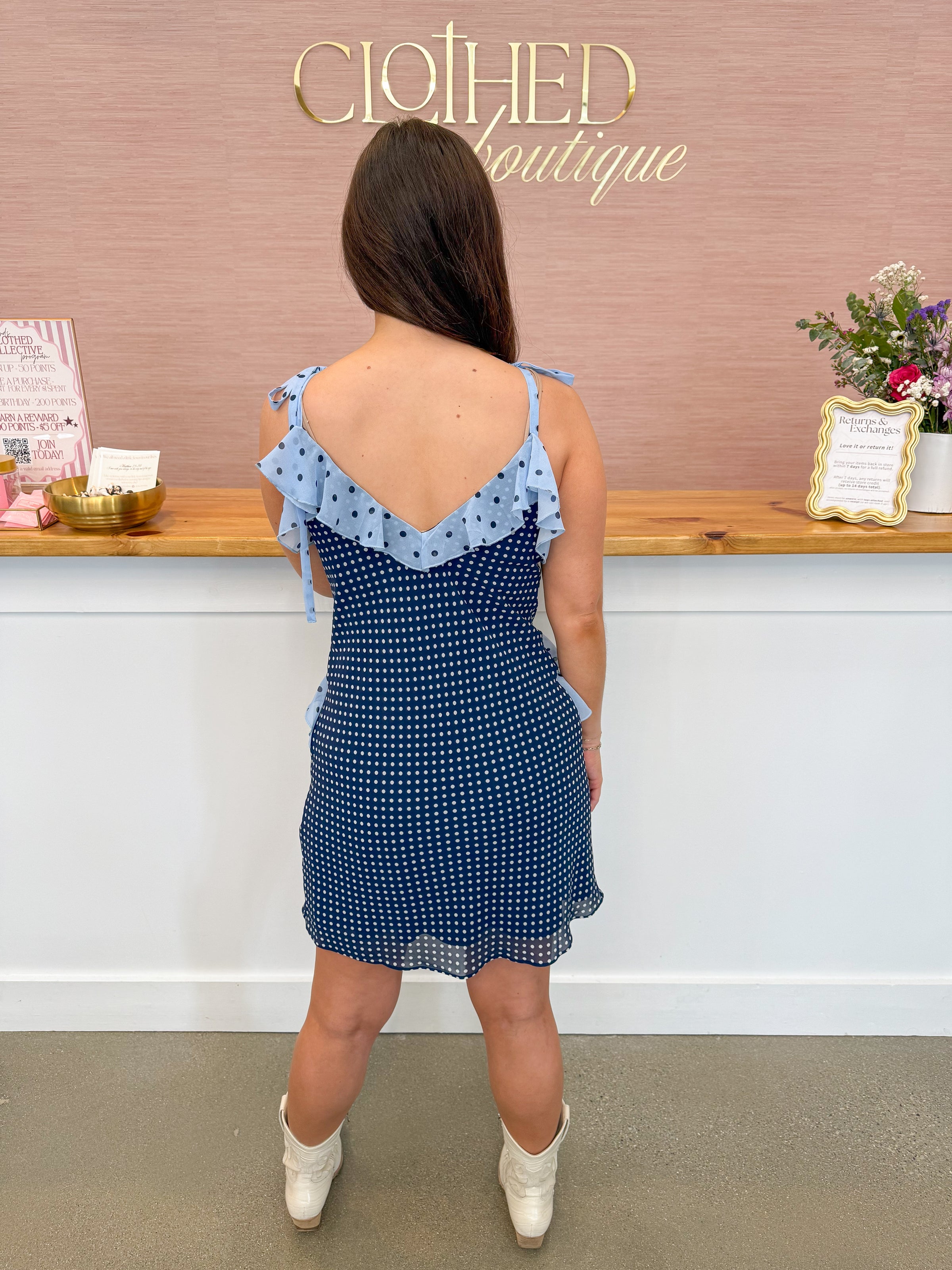 - Navy mini dress featuring white polka dots throughout, light blue contrast ruffle details with bigger navy polka dots, adjustable ties at the shoulder. Fully lined