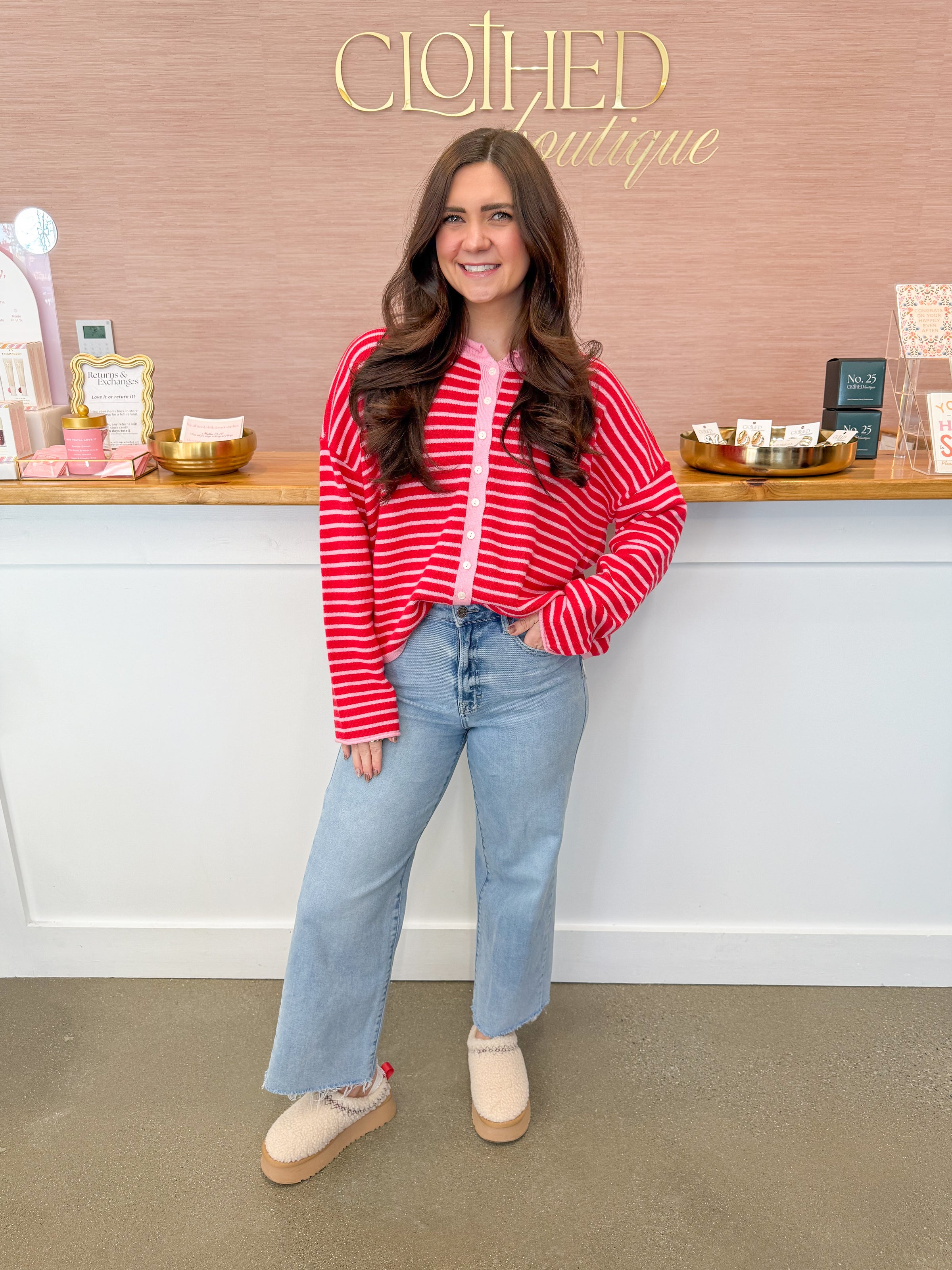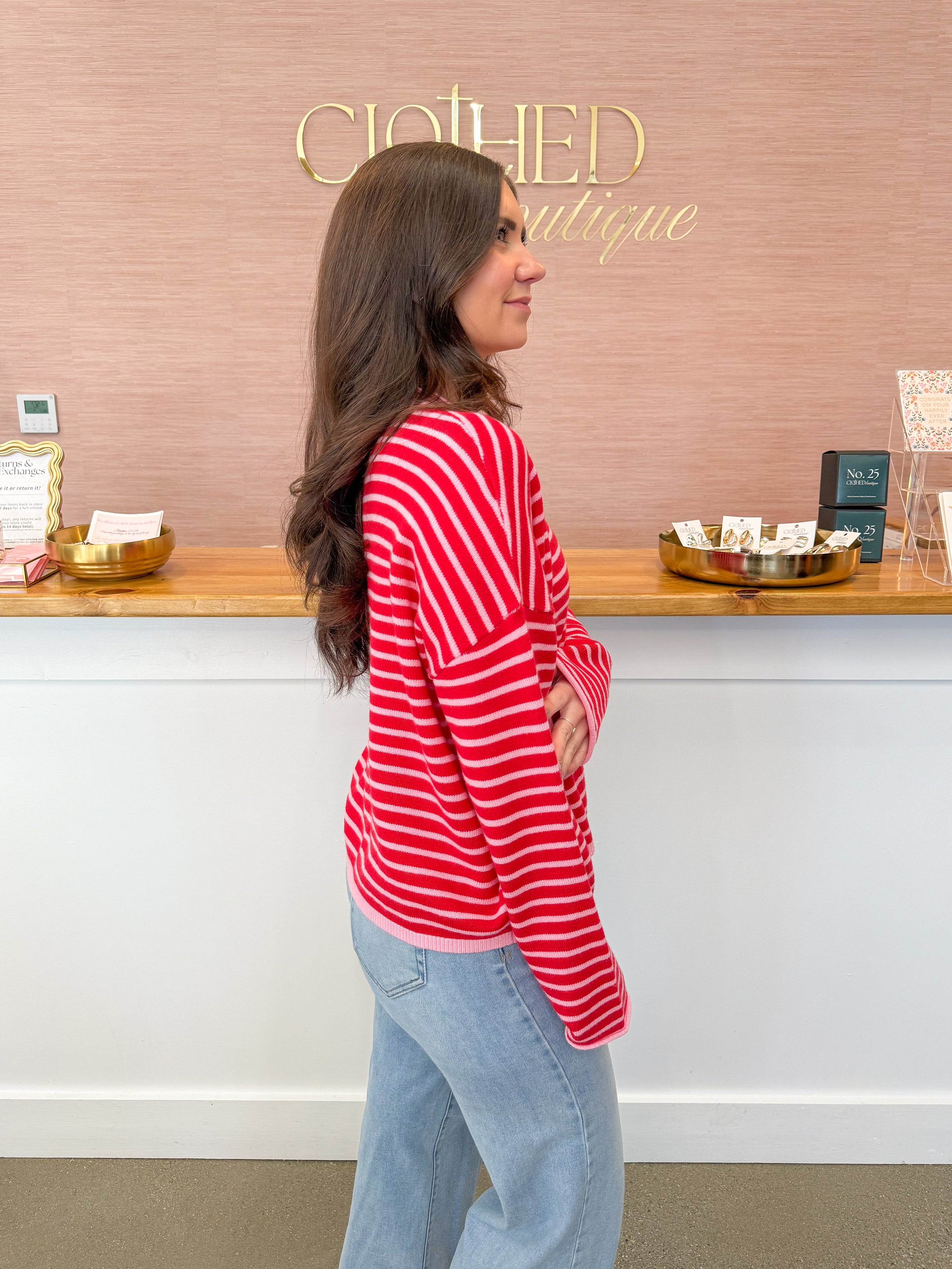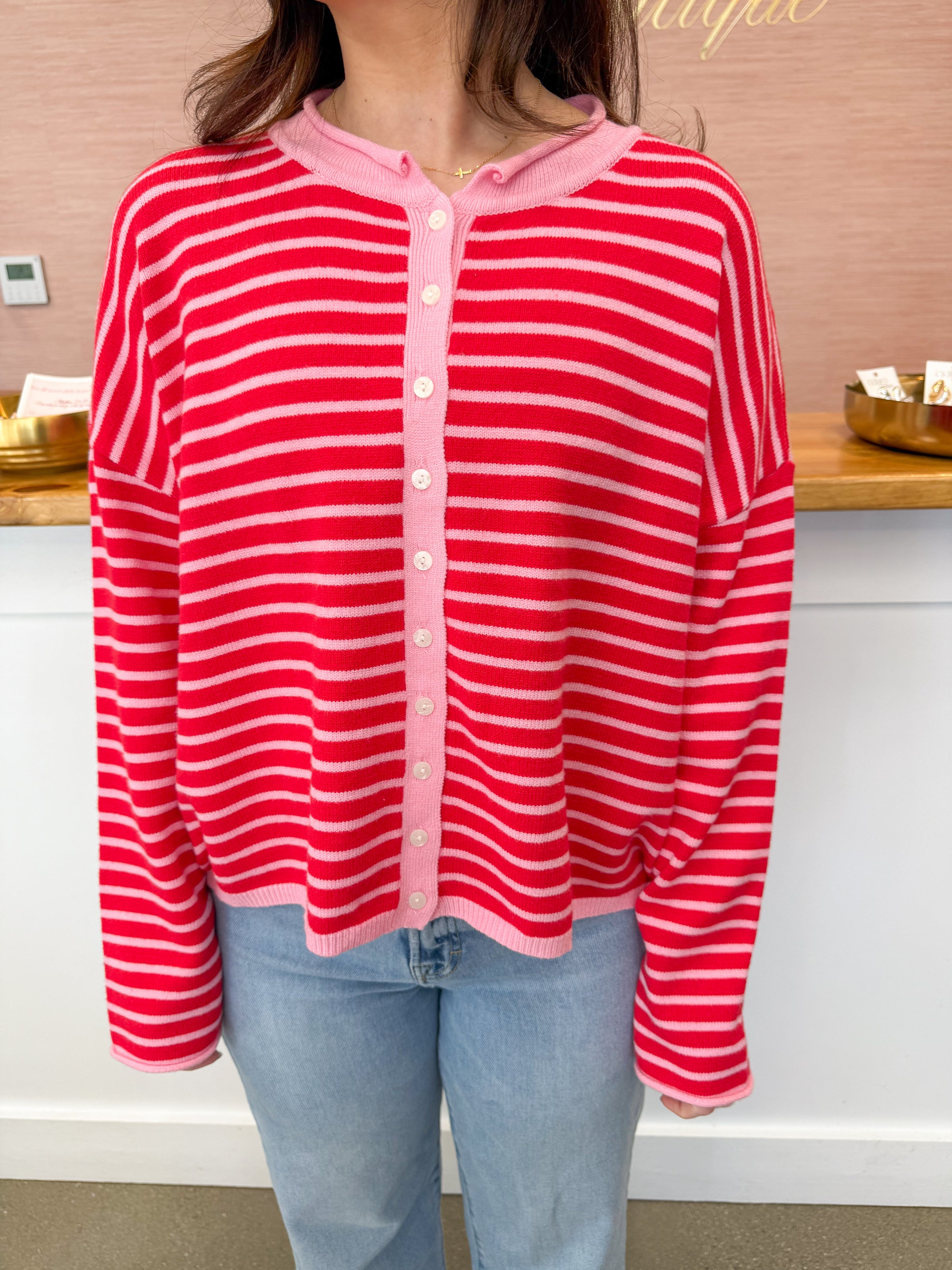 - Pink and red striped cardigan featuring fully functional buttons, and a rolled collar neckline