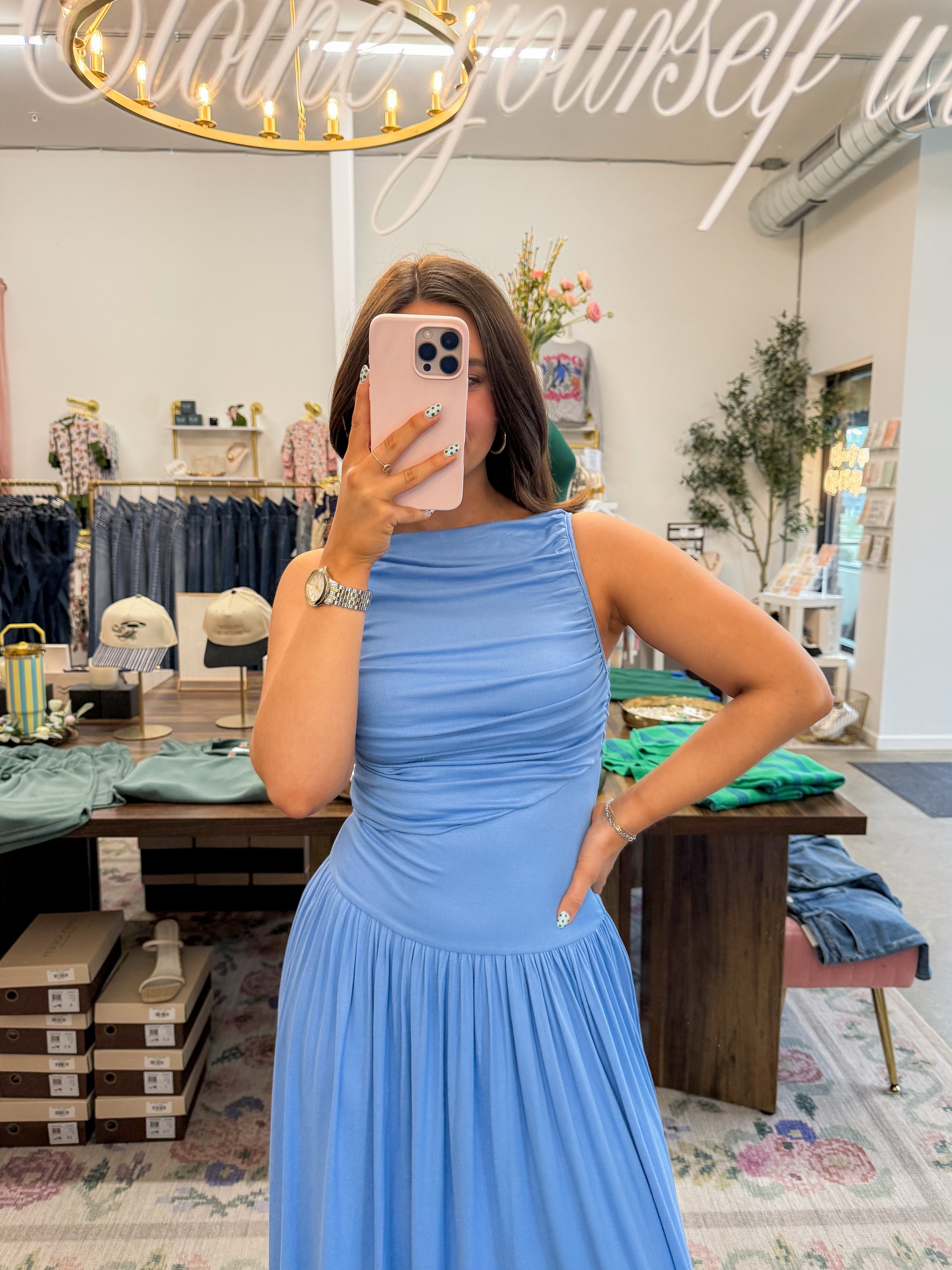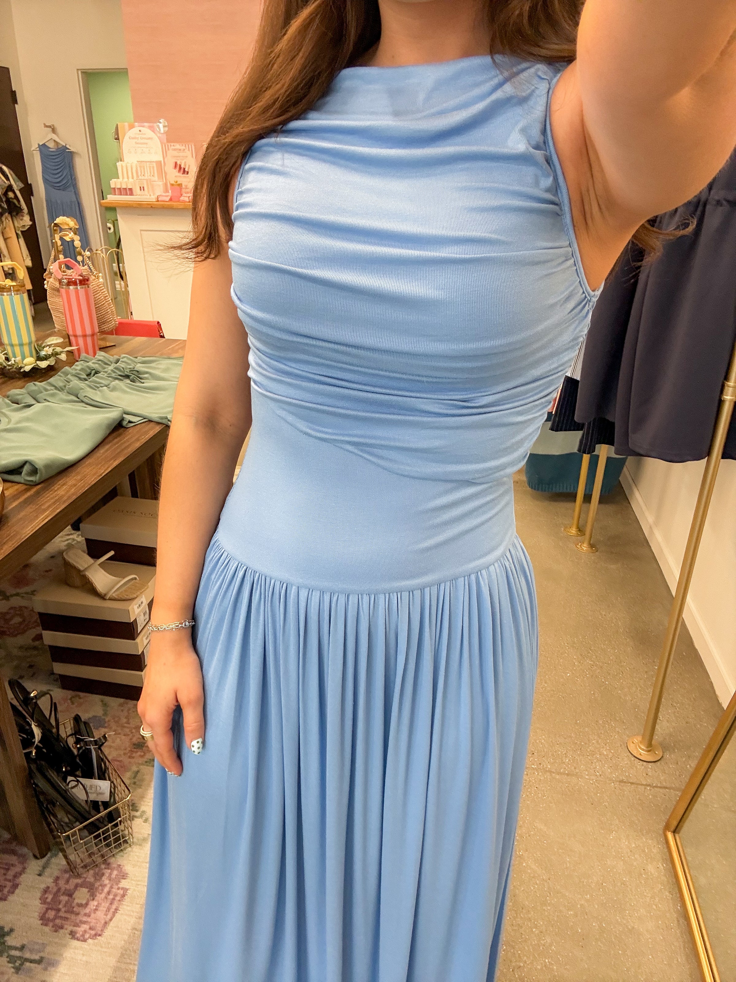 - Light blue maxi dress featuring a high neckline, ruching detail throughout the top, drop waist, and flowy skirt. Stretchy & soft material