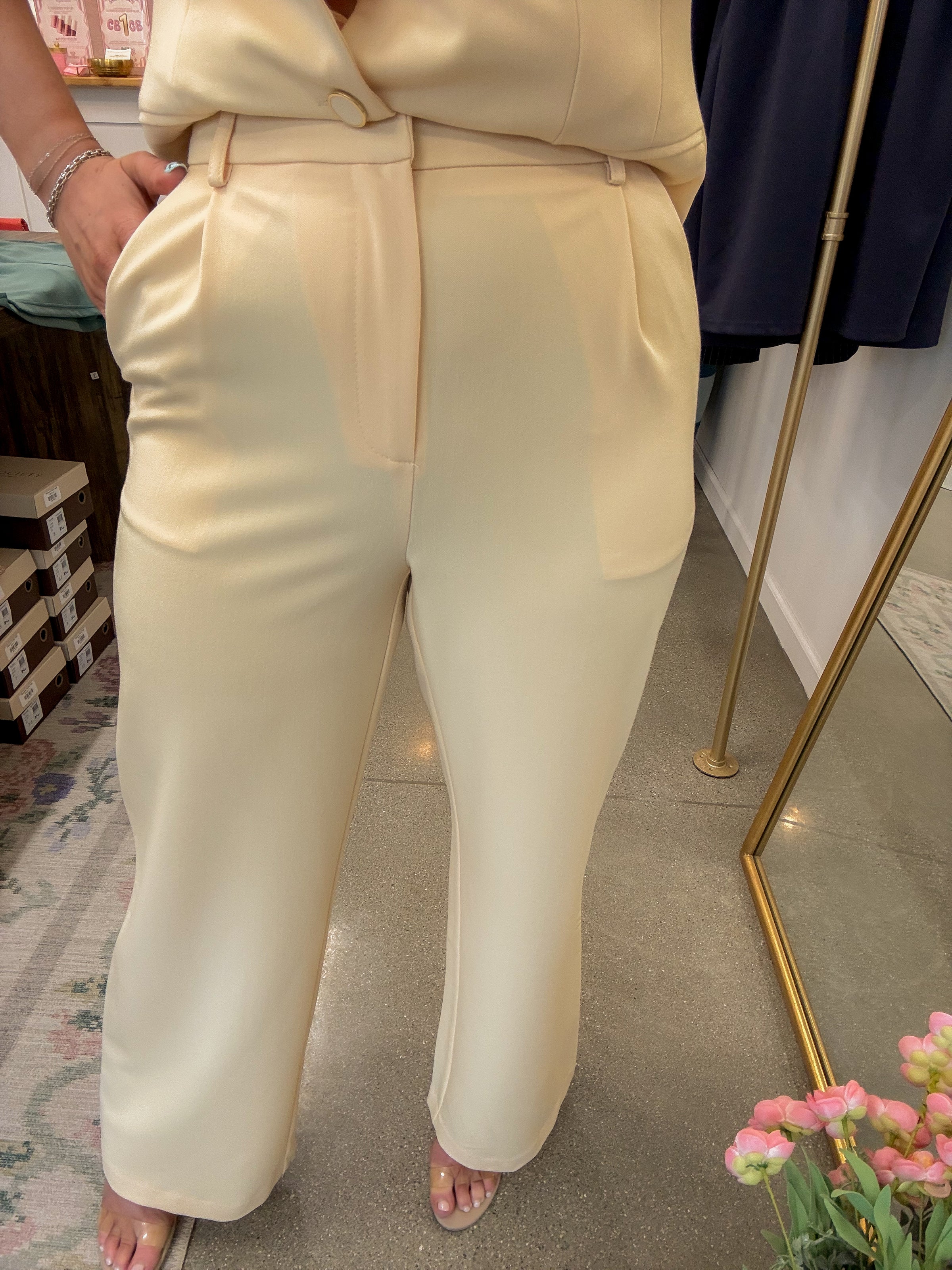 - These butter yellow trousers are a spring & summer wardrobe staple! Pair it with the matching short sleeve blazer for a complete look!