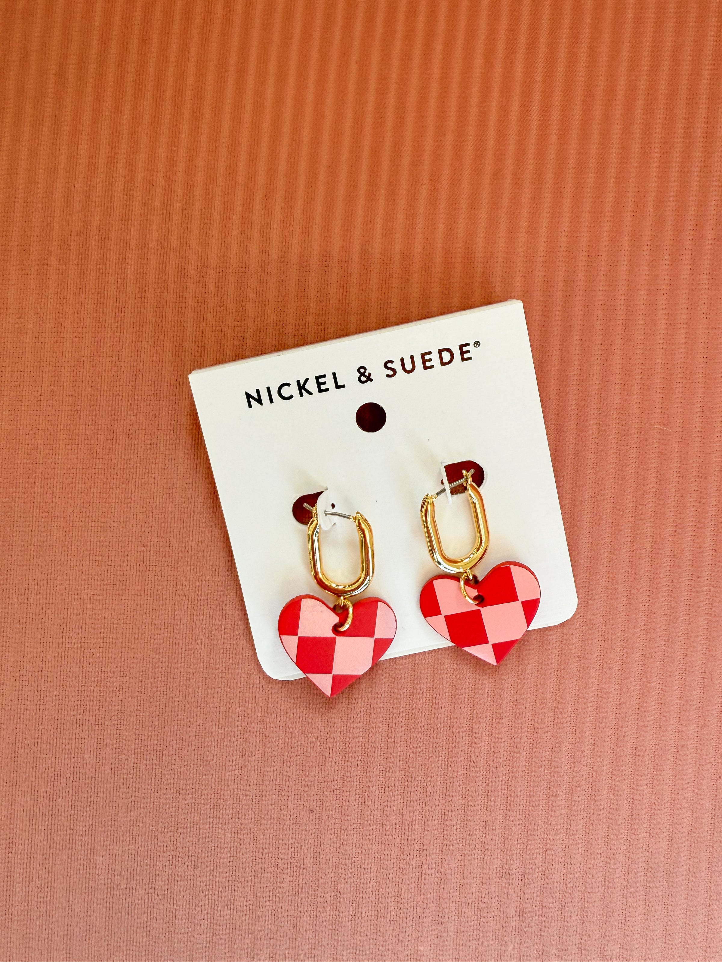 - Gold huggie hoops featuring a crimson and pink checkered leather heart