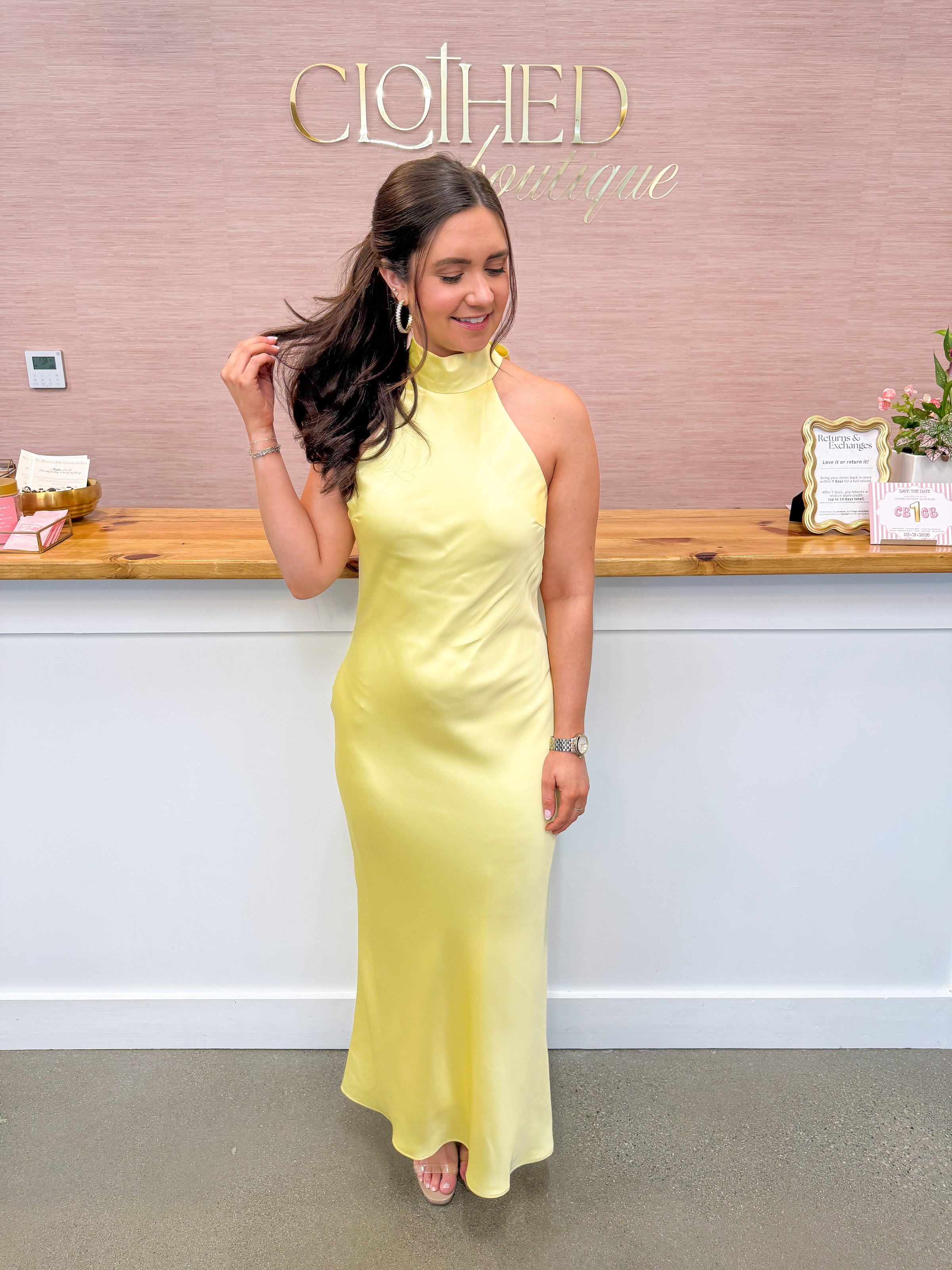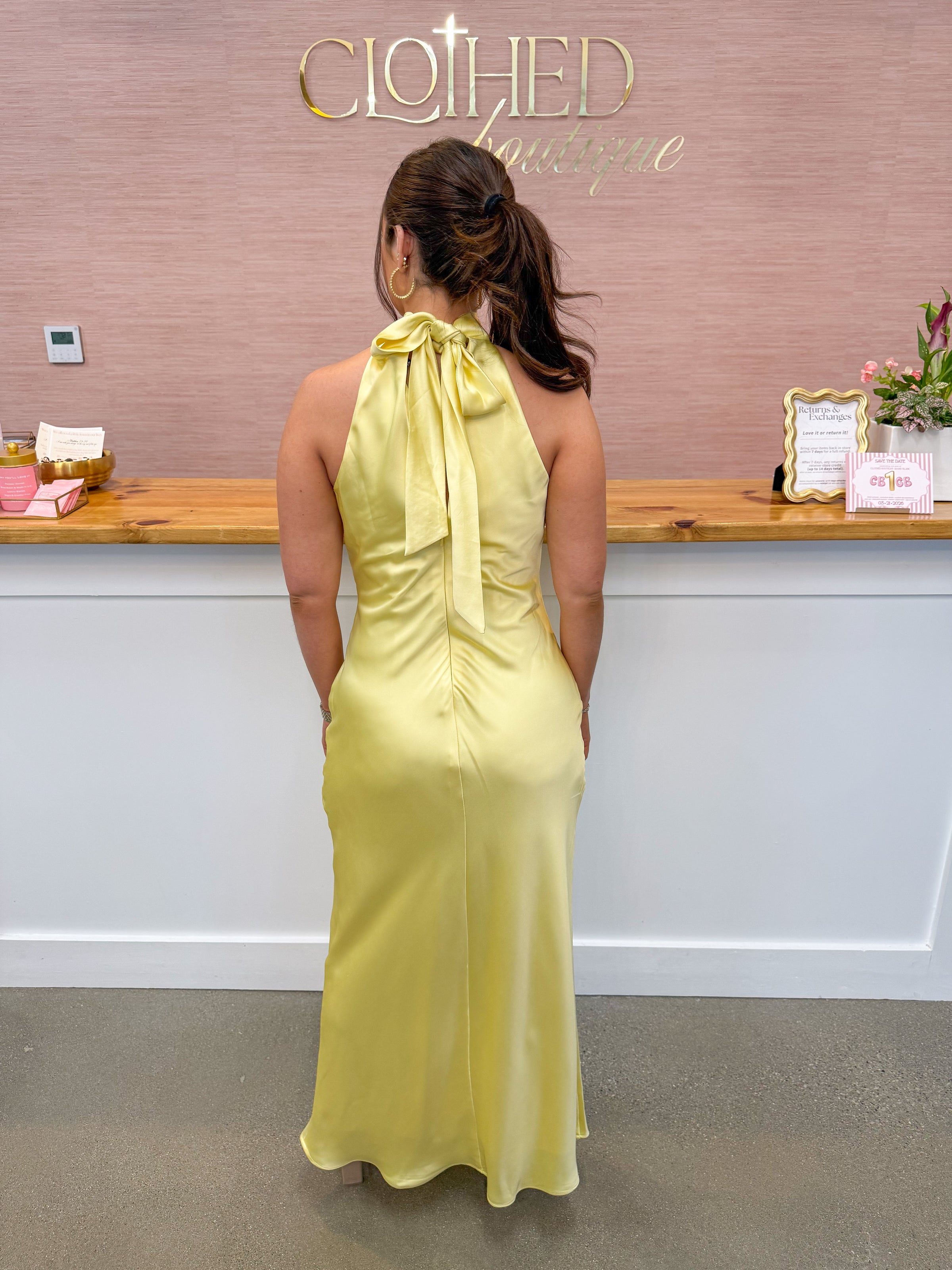 • Butter yellow satin maxi dress featuring a mock neckline, small opening in the back, functional zipper up the back, and tie back closure. Fully lined