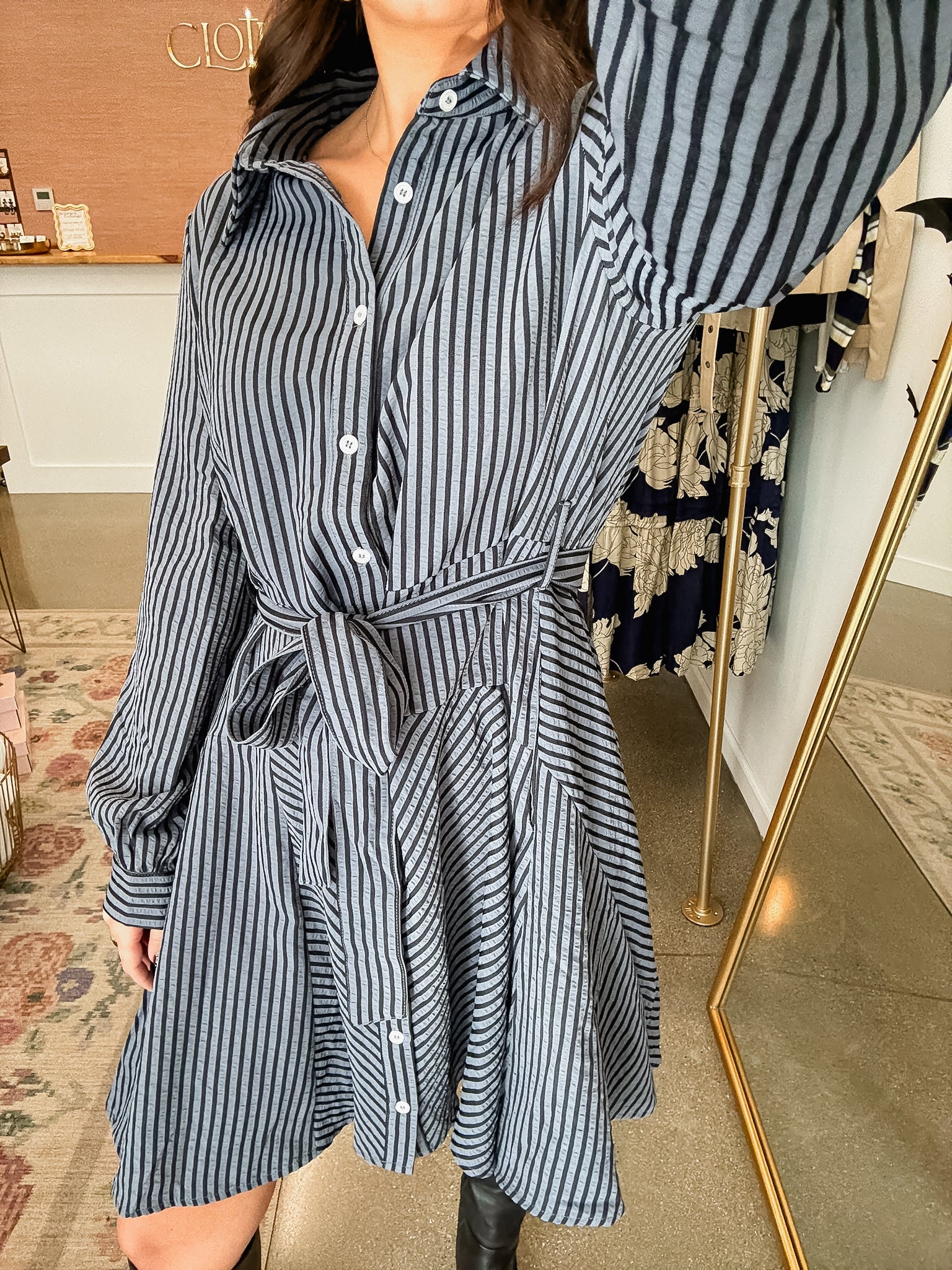 - Blue dress featuring navy stripes throughout, collared neckline, fully functional buttons up the front, and adjustable tie belt