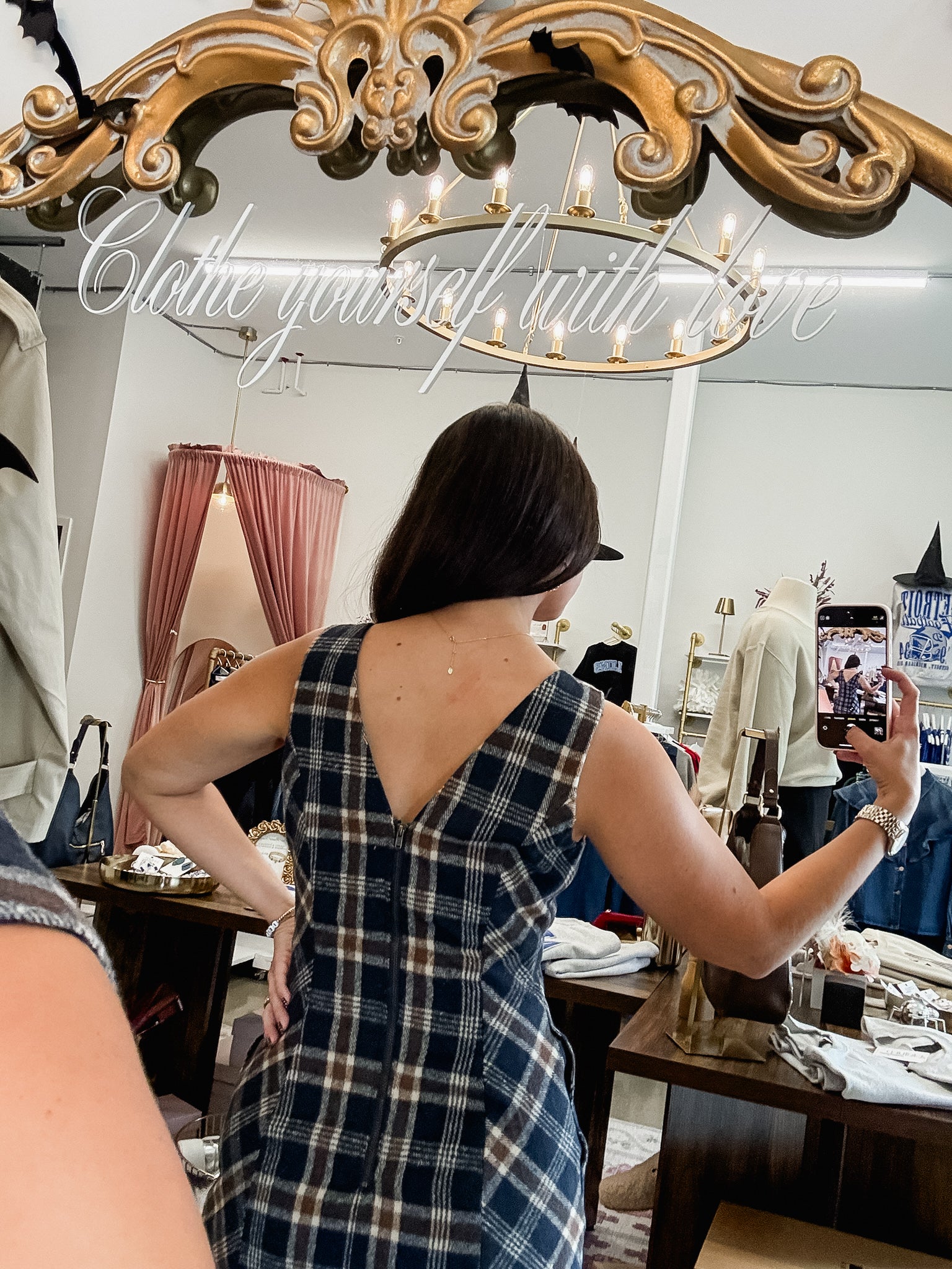 - Navy blue dress featuring plaid pattern throughout in brown, tan, and off-white, rounded neckline, v detail in the back, fully functional zipper up the back. Fully lined