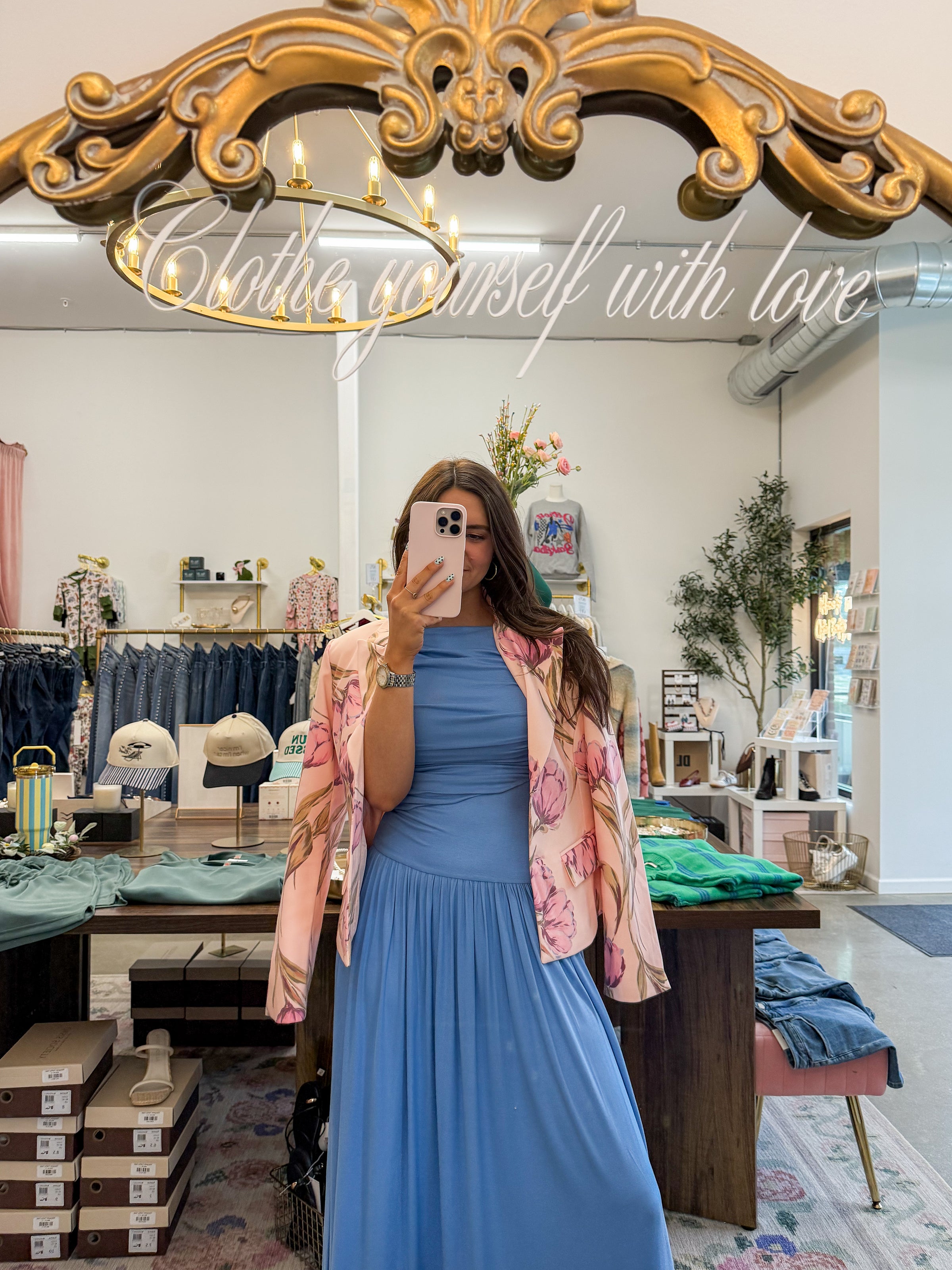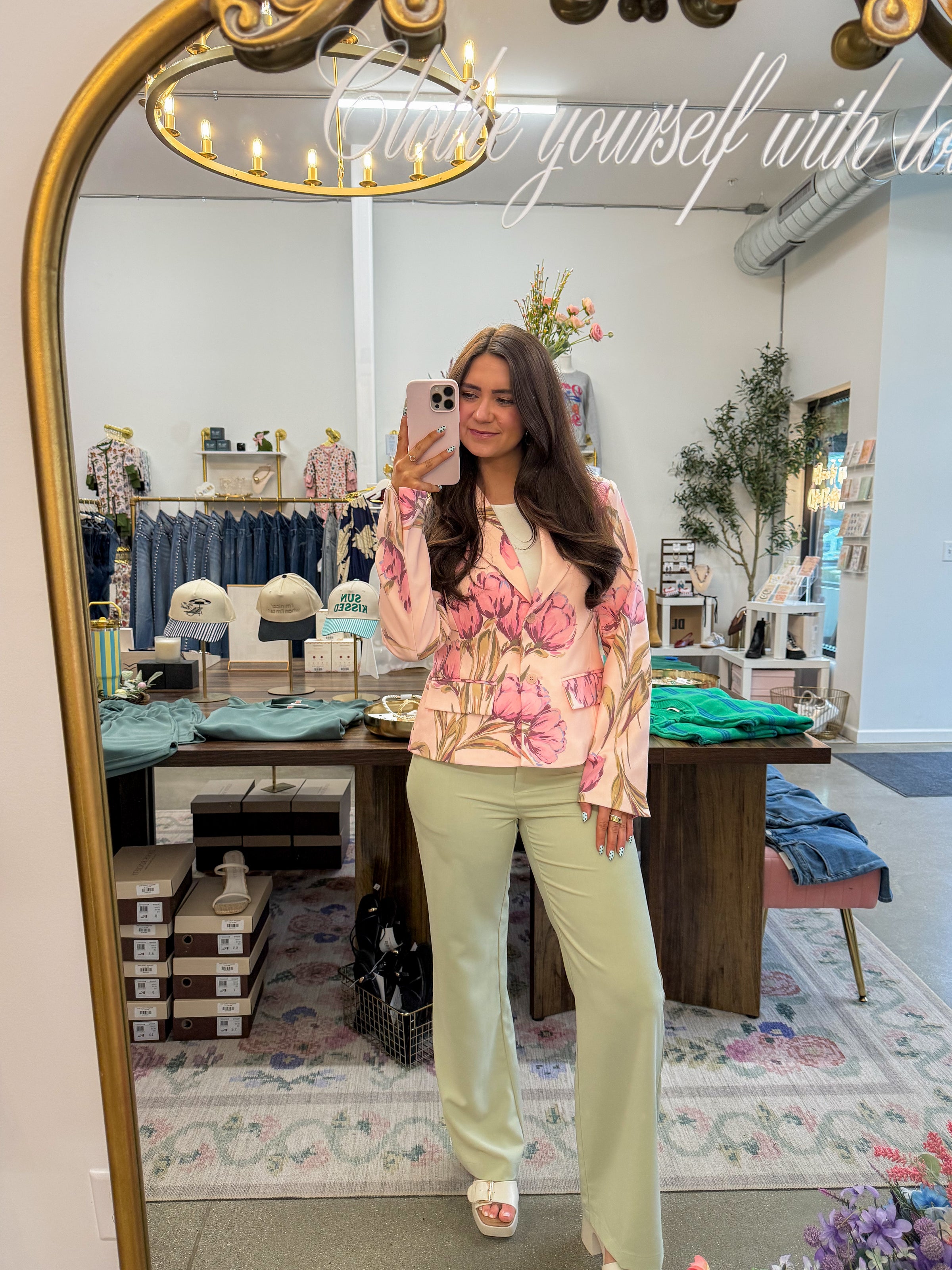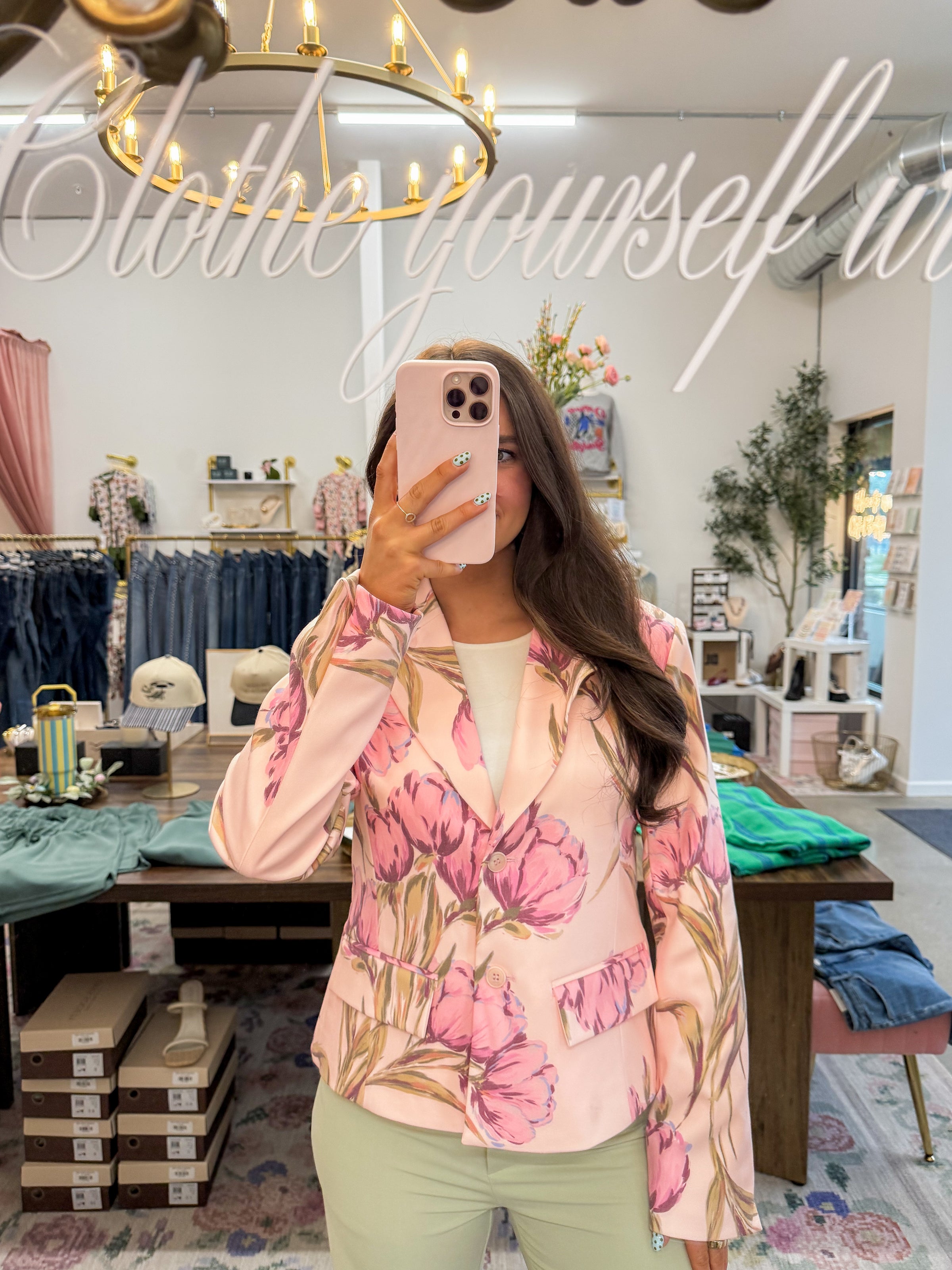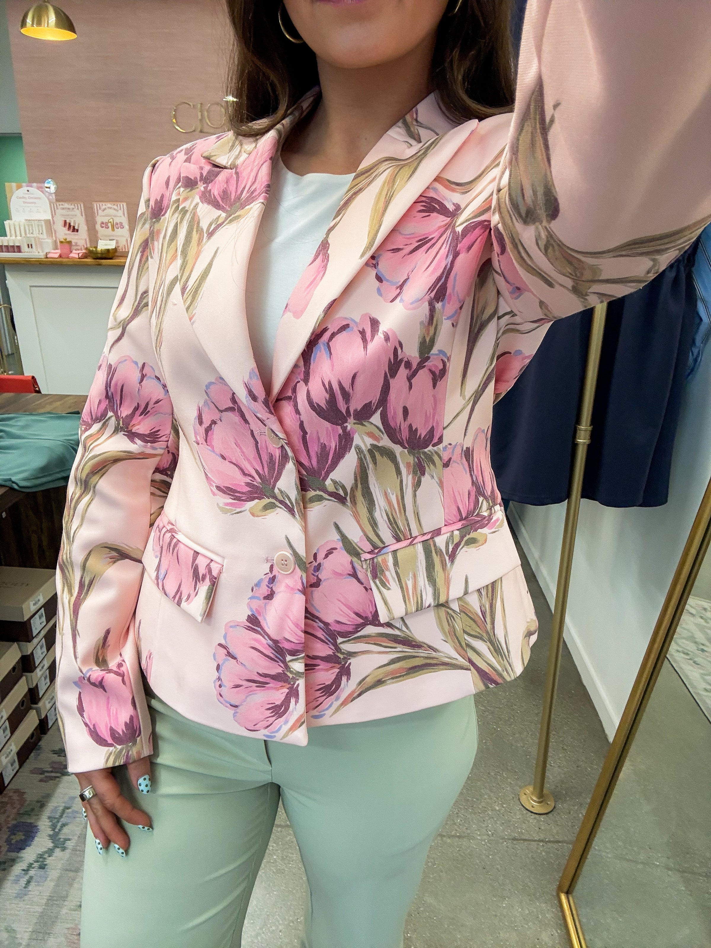 • Light pink structured blazer featuring florals throughout in a darker pink, sage, and a hint of blue. Functional buttons, faux front pockets. Fully lined