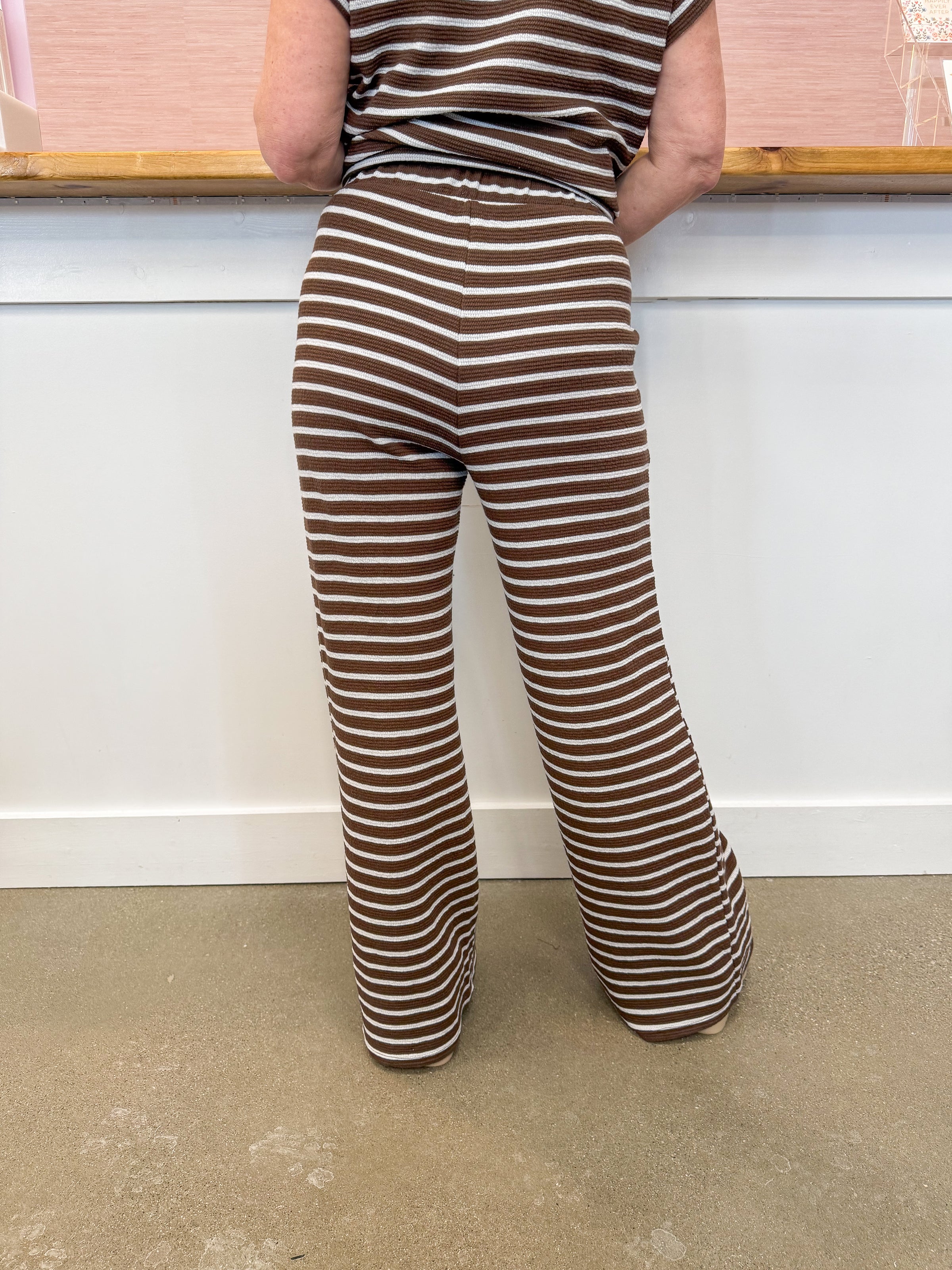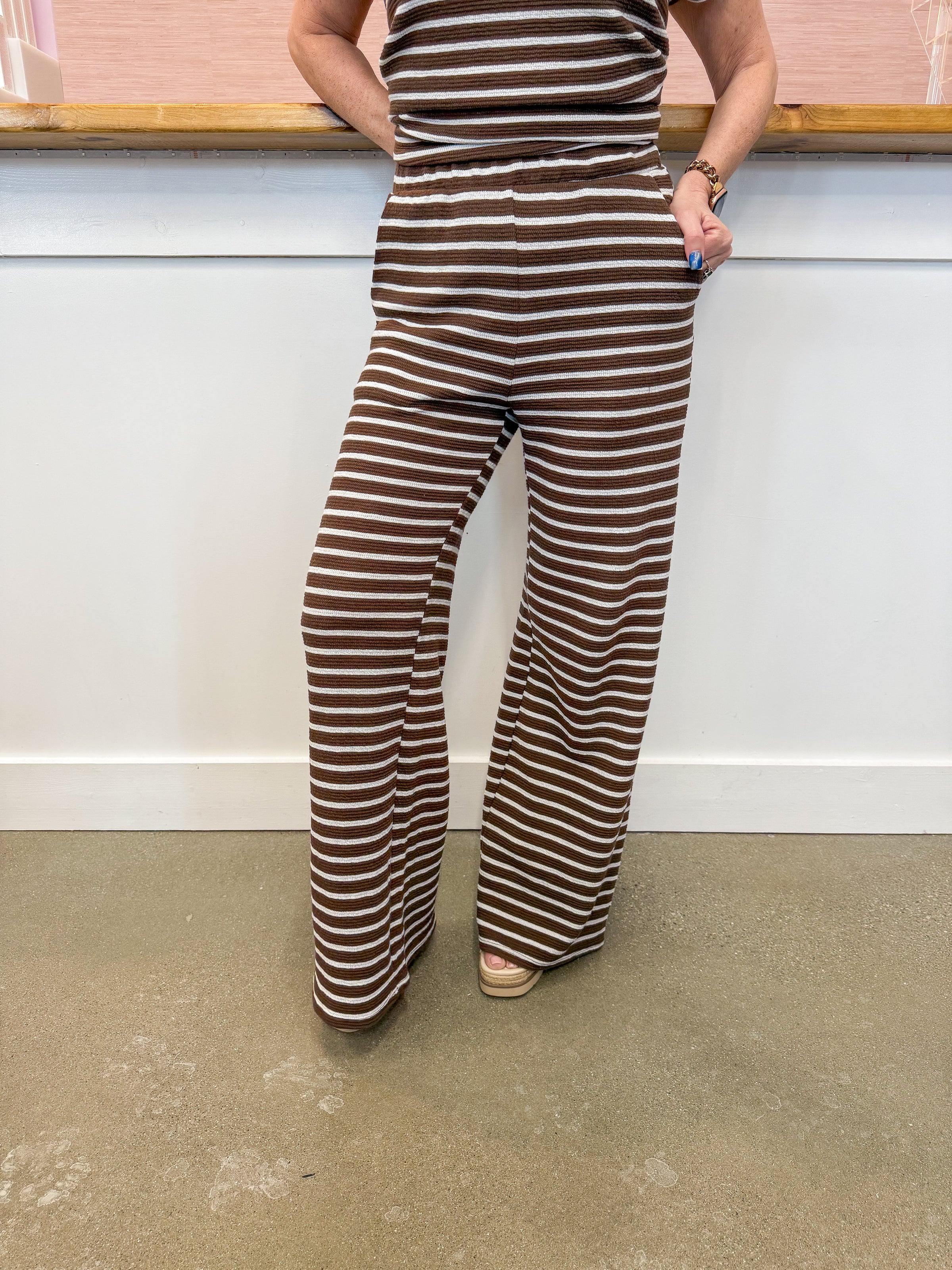 - Chocolate and ivory striped wide leg pants featuring an elastic waistband and side pockets