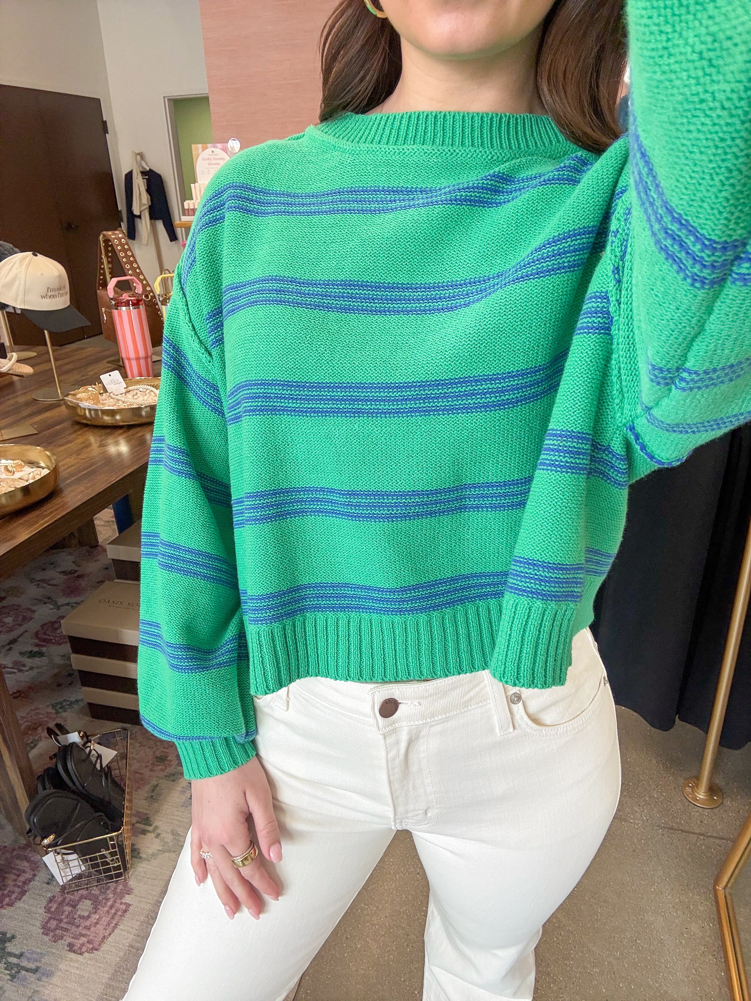 - Kelly green sweater featuring blue stripes throughout. Rounded neckline with a boxy fit