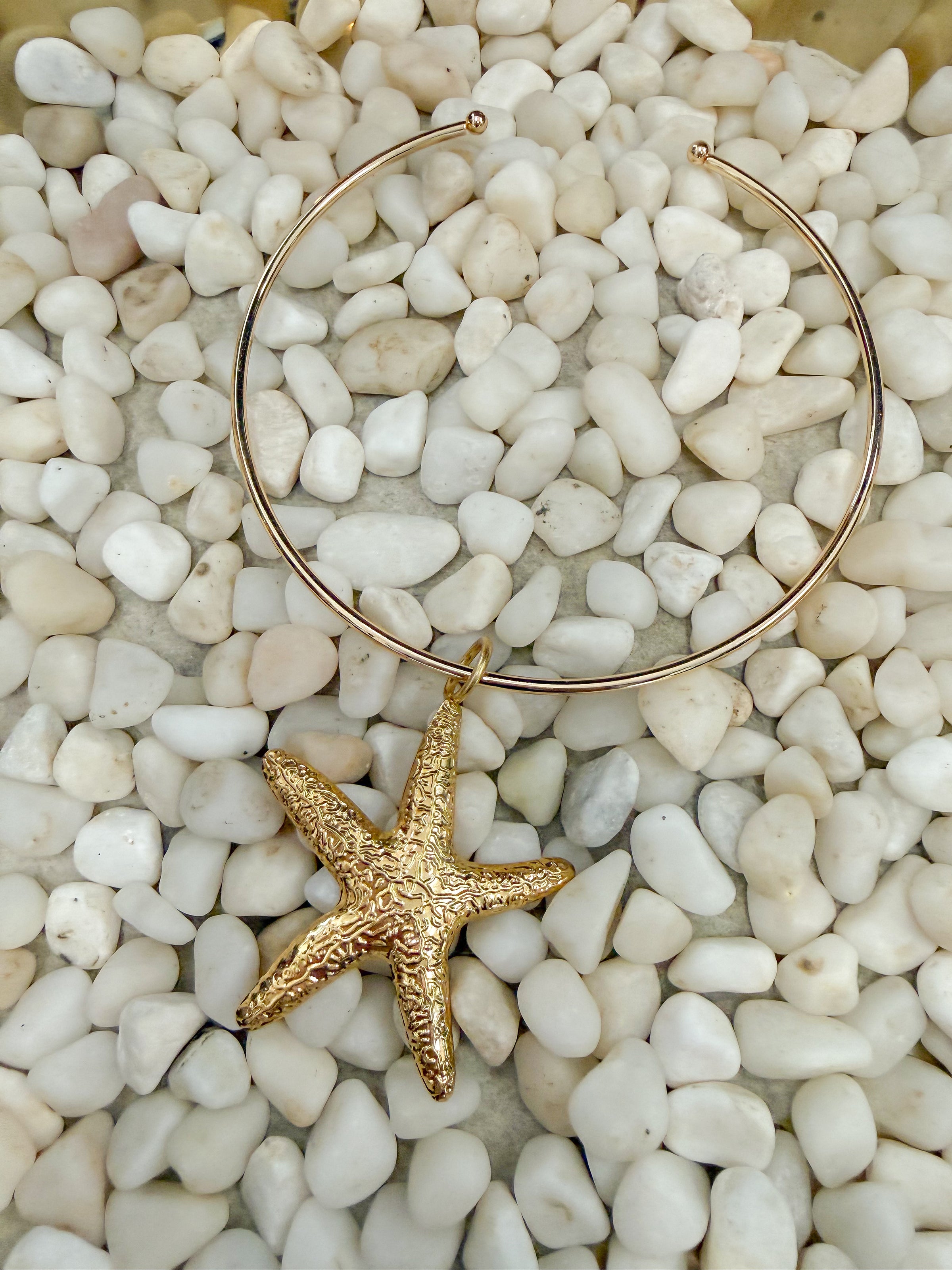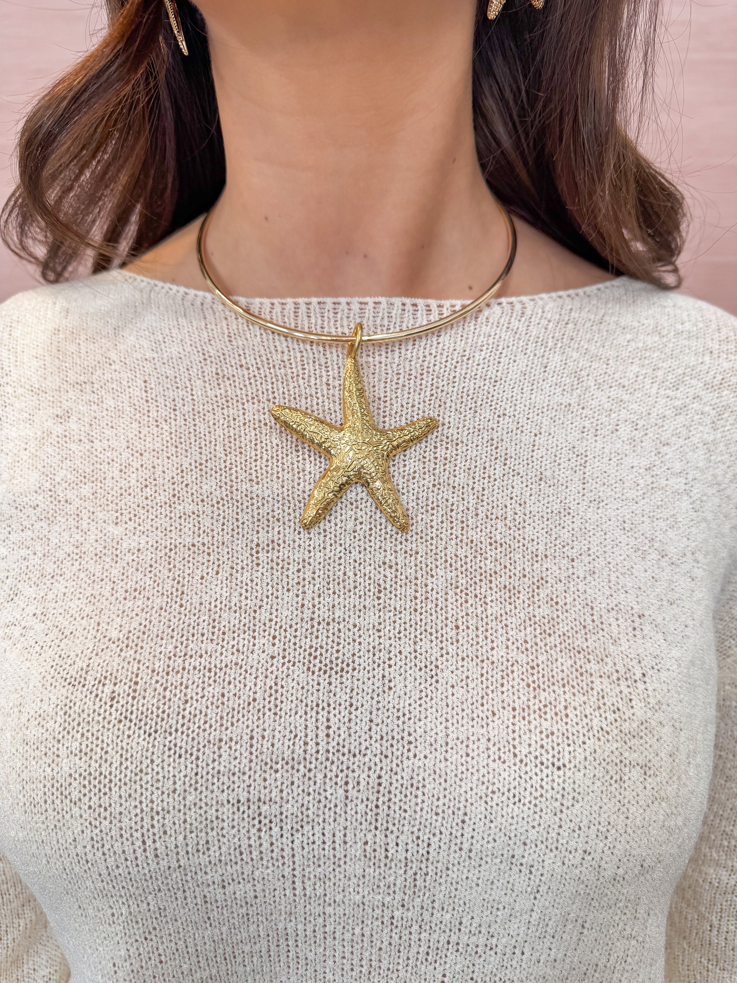 - Gold choker necklace featuring a textured starfish pendant