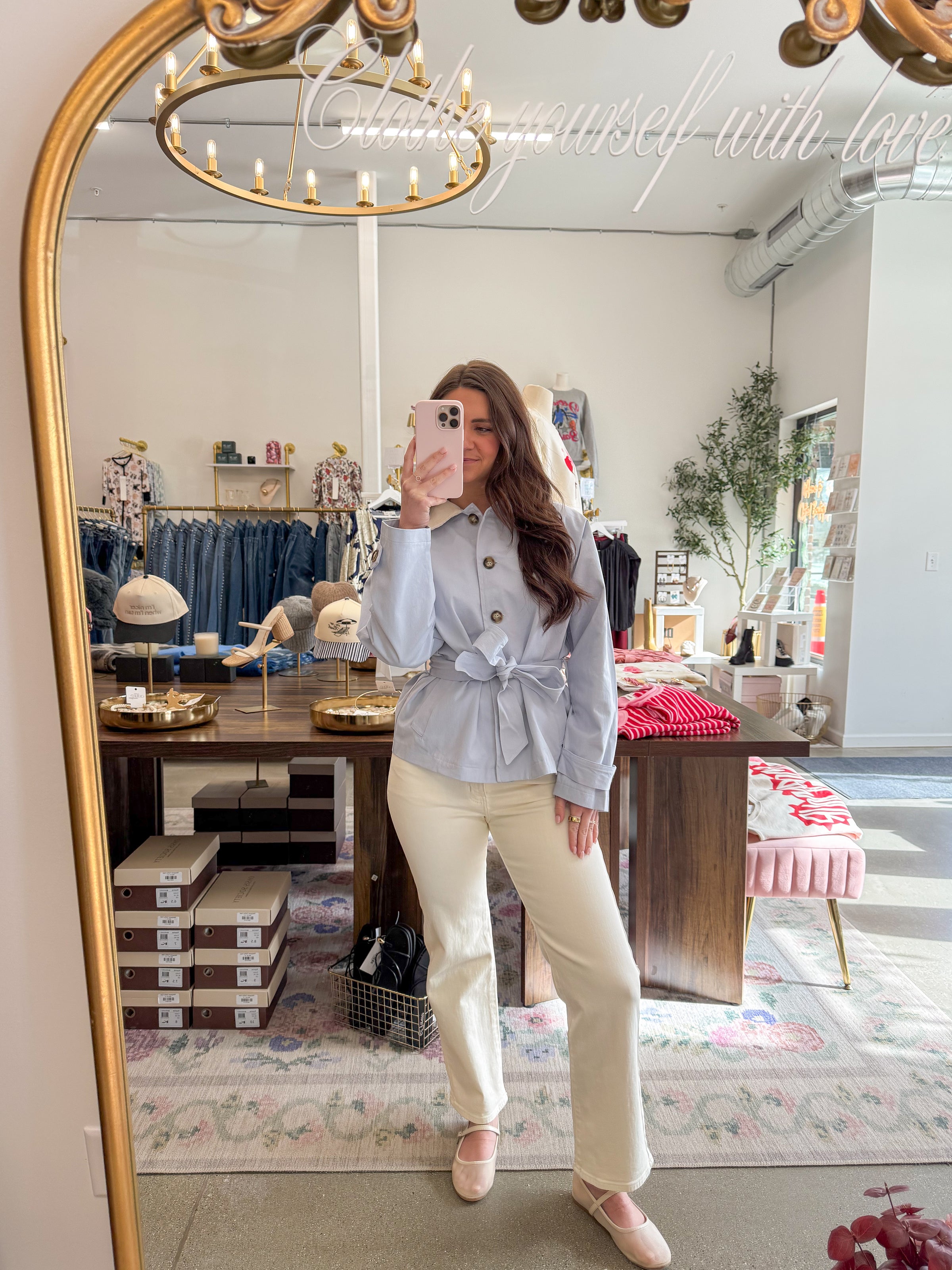 - Light blue trench coat featuring a corduroy cream collar, fully functional buttons up the front, tie belt, and side pockets.