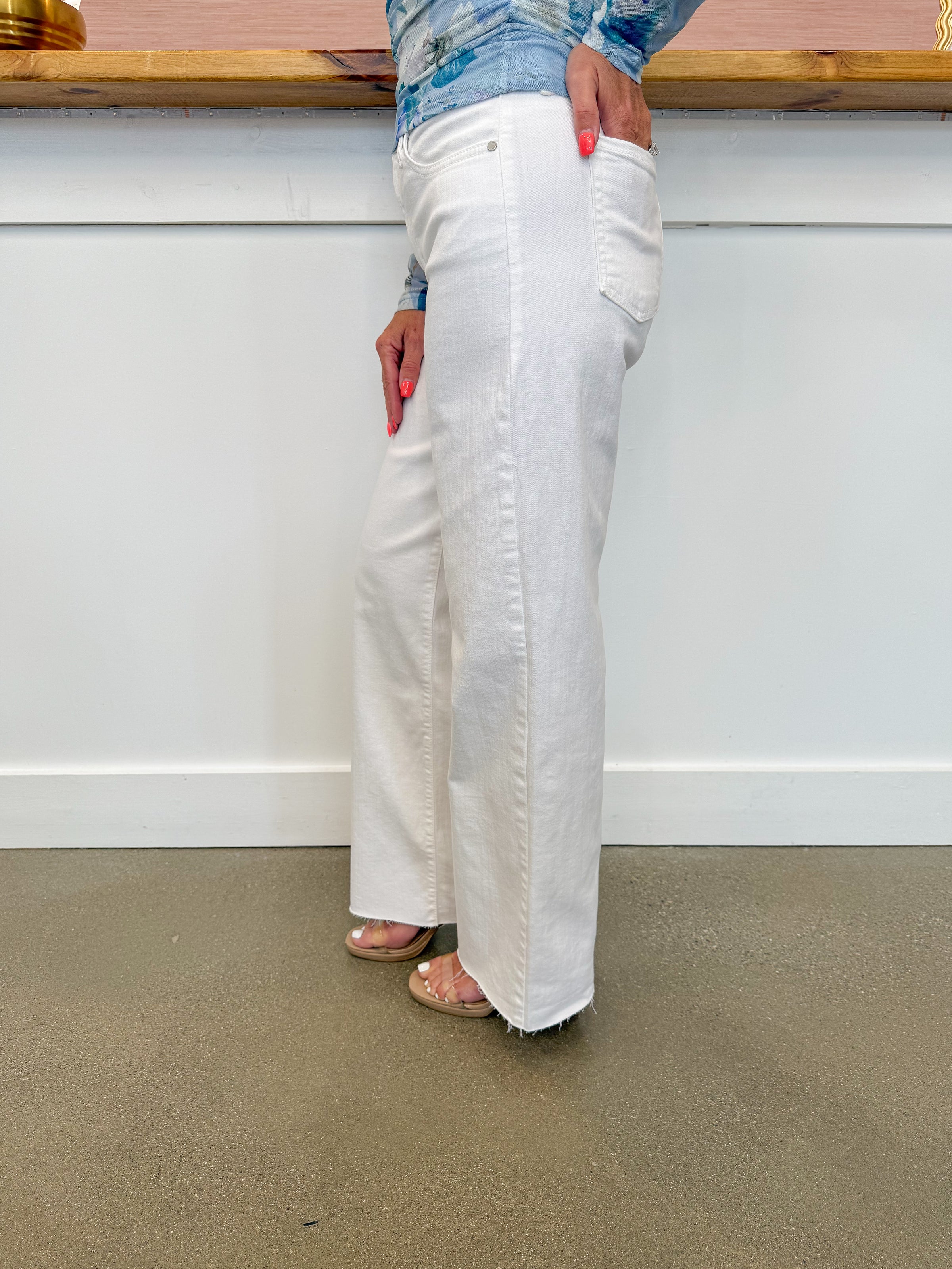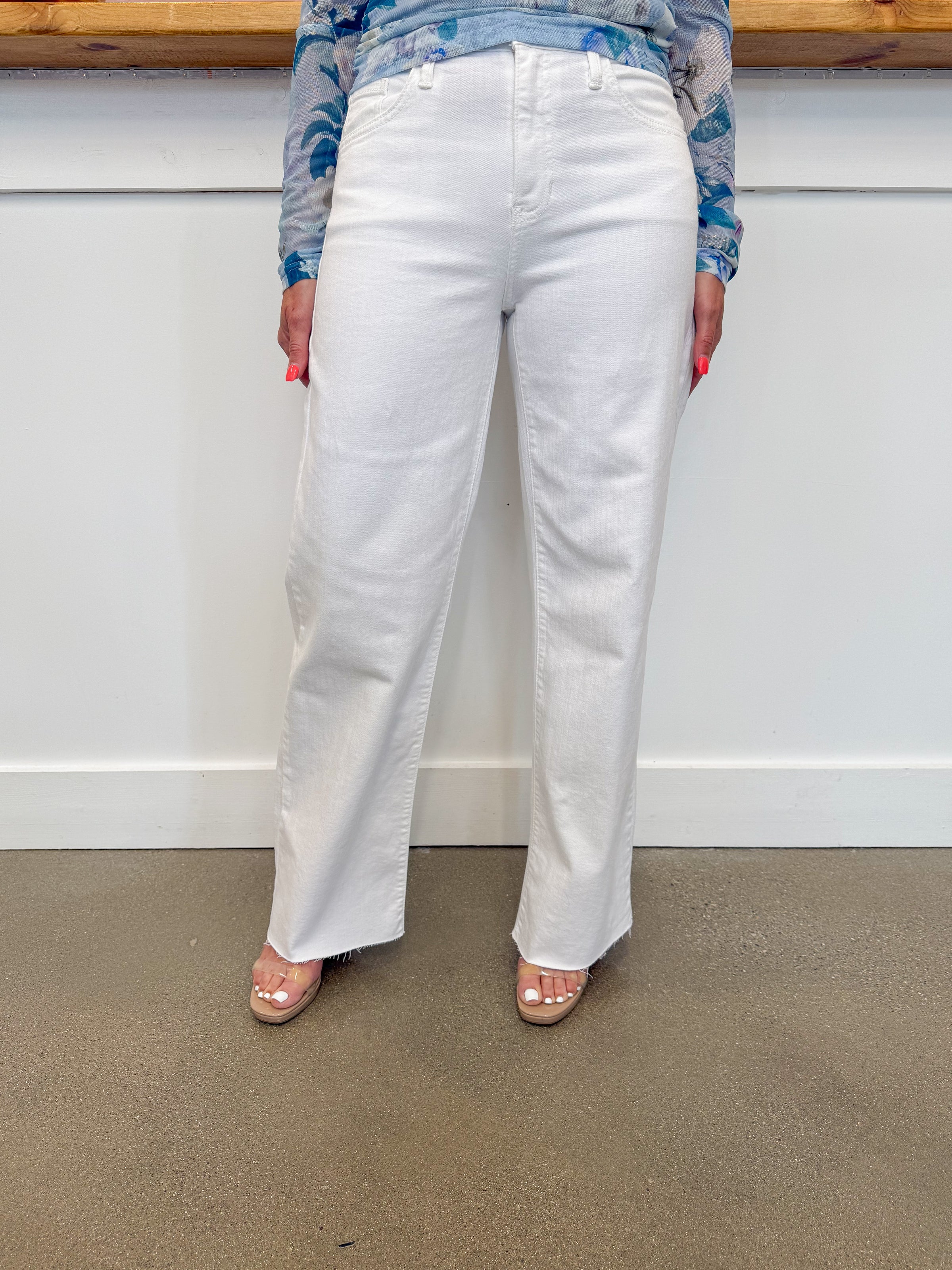 - White slim leg denim featuring a mid rise fit, raw edge hem, front and back pockets, functional button and zipper closure, and belt loops