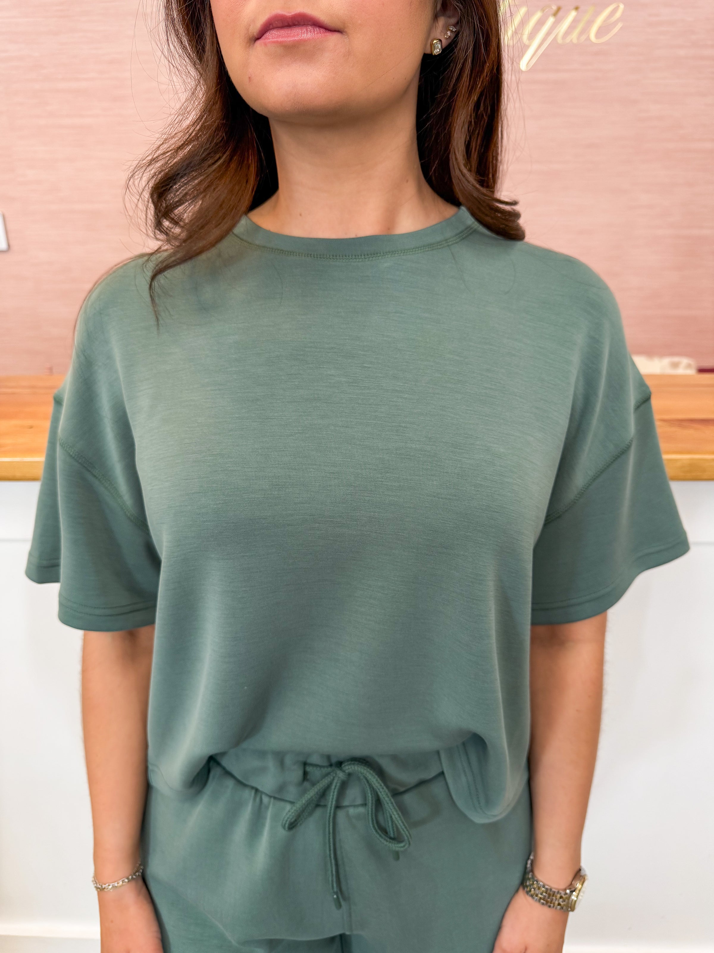 - Top: green modal t-shirt featuring a rounded neckline and boxy fit
