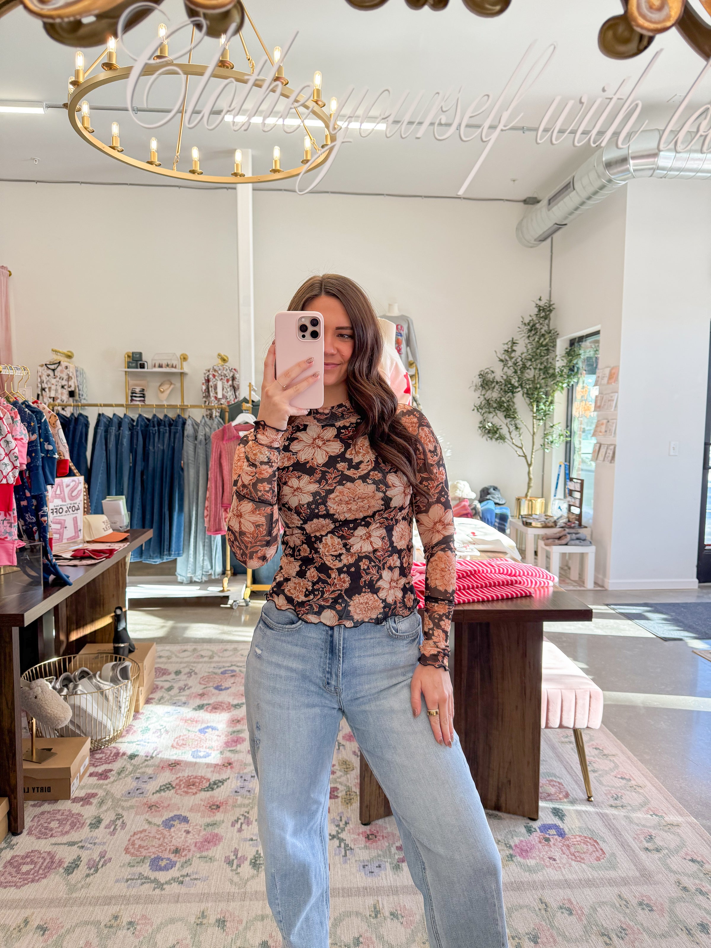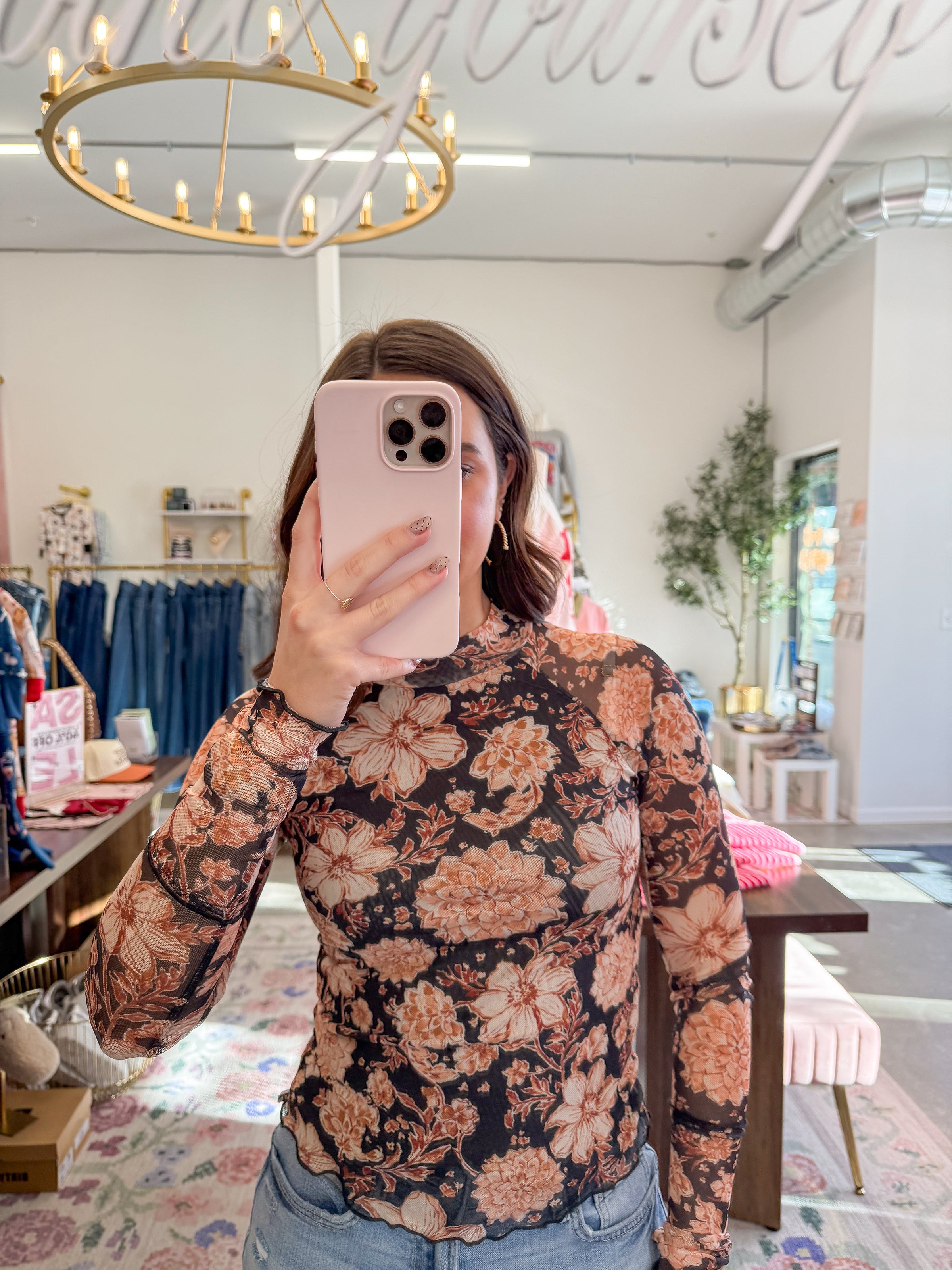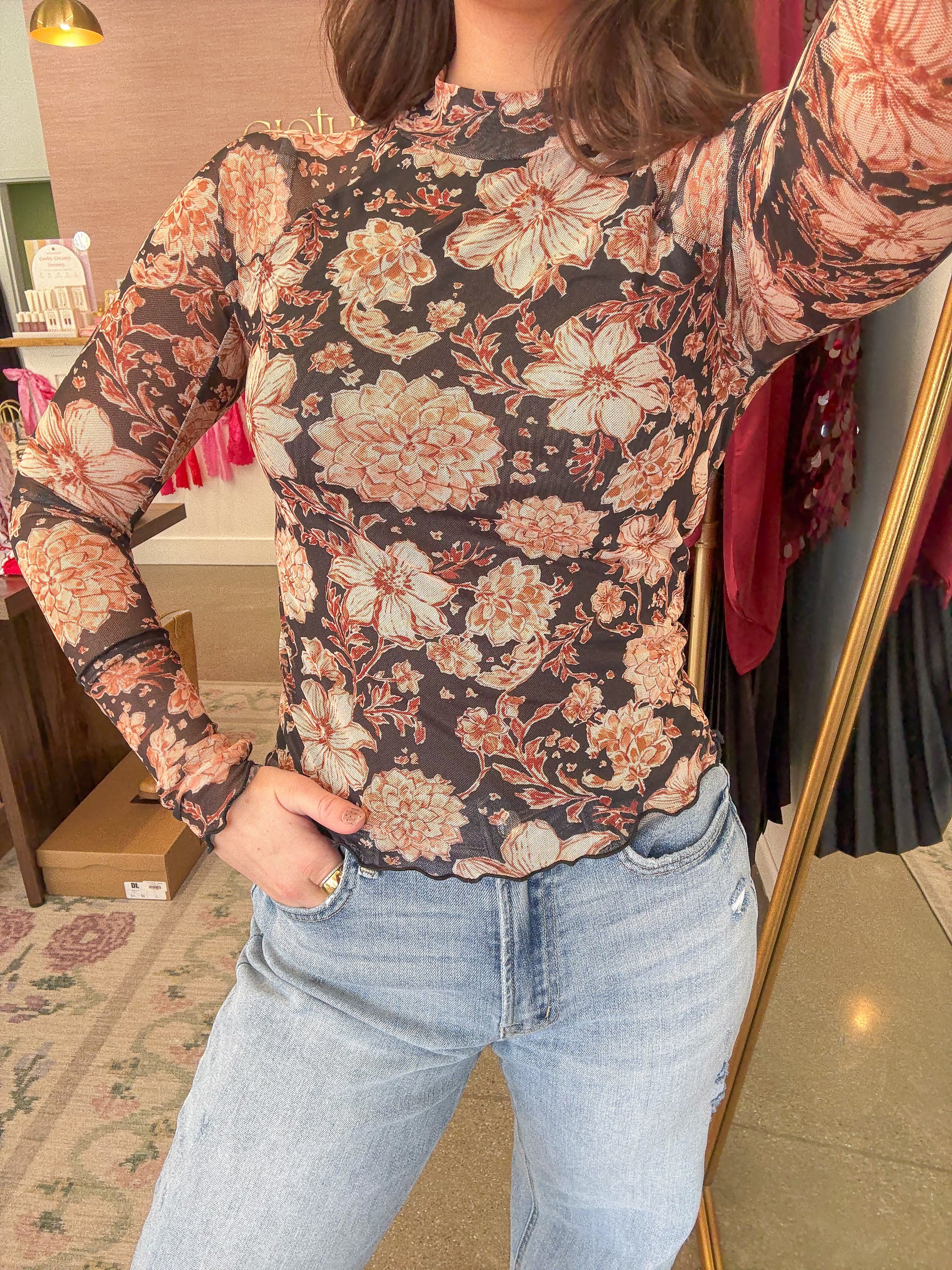 - Black sheer long sleeve featuring a floral print pattern in neutral, peach, and orange shades. Mock neckline, lined in the chest, scalloped hem, and thumb hole