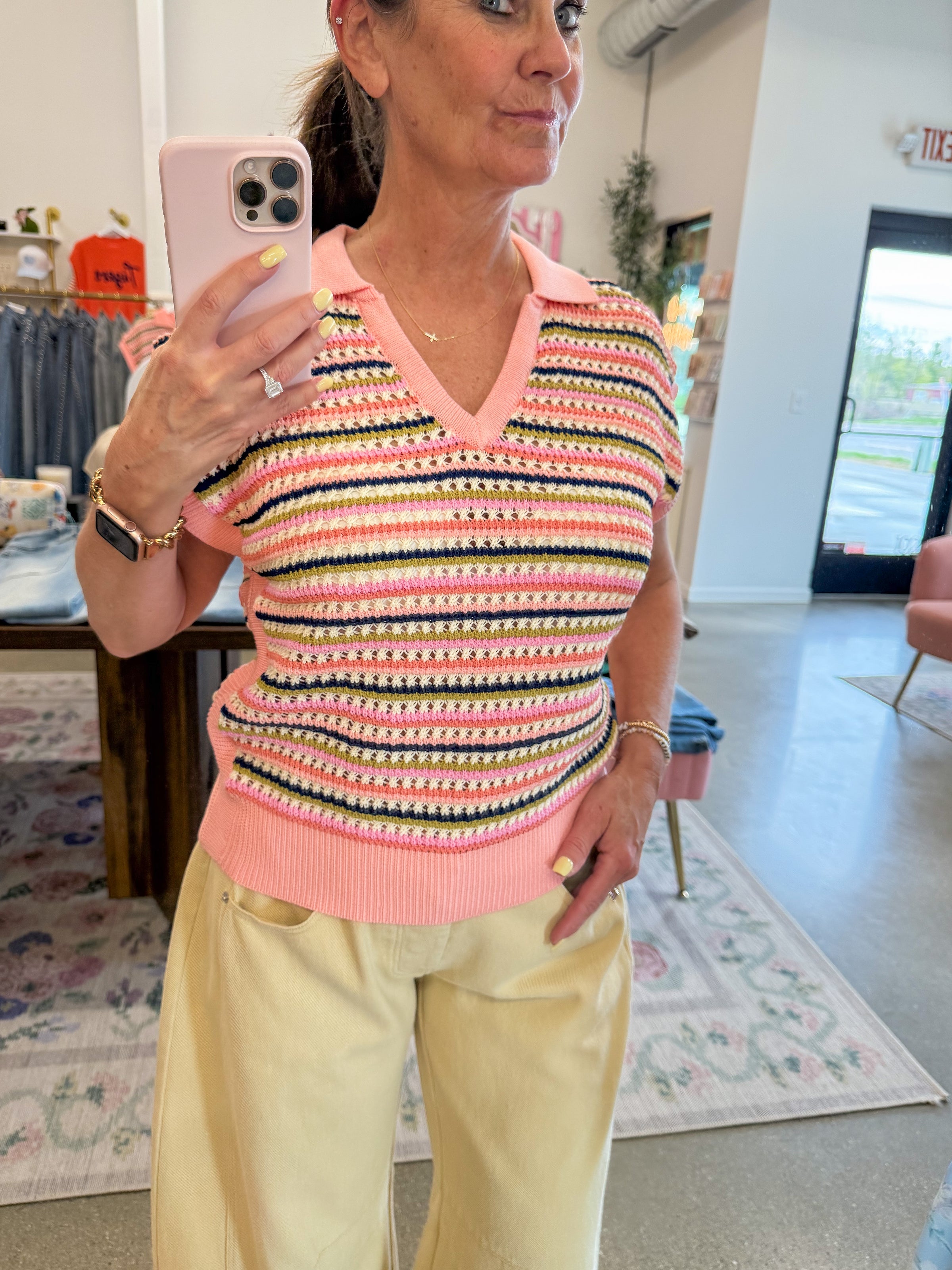 - Peach knit top featuring stripes throughout in shades of navy, olive, and cream, collared neckline, short sleeves.
